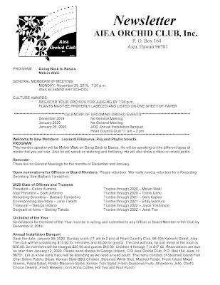 A non-profit organization founded in 1953, located on the island of Oahu, Hawaii. We are a group of local orchid lovers! Monthly membership meetings are held on the 4th Mondays (except for December & January), and the annual show & plant sale is set for a weekend in June at Aiea Elementary School cafeteria. Come join us for good fun! ~ Email : aieaorchidclub@yahoo.com ~ Facebook : Aiea Orchid Club