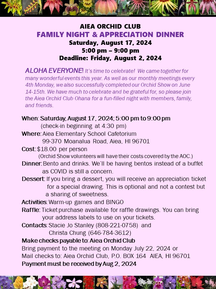 Monthly Members' Meeting with informative lectures, 4th Monday 7:00 p.m., at Aiea Elementary School Cafeteria, 99-370 Moanalua Road, Aiea, Hawaii 96701 (excerpt for December and January.) Activities include shows, family night, auction, banquet, field trips and much more. Come and join us for orchid fun! email: aieaorchidclub@yahoo.com